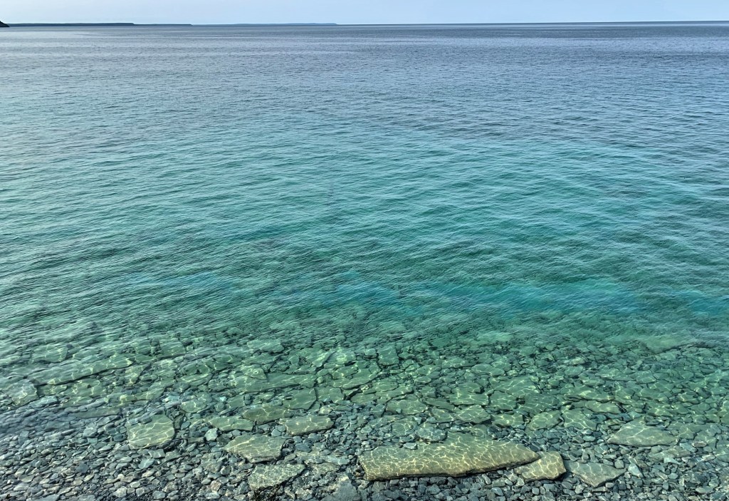 781. The waters of Georgian Bay are cold and remarkably clear, as here where the Trail, approaching today’s Rush Cove end point, runs along the shore. In Tobermory, there is only one month, August, when the water temperature climbs above 20C, that is recommended for swimming. By now (late September), the temperature is usually 14C or less.