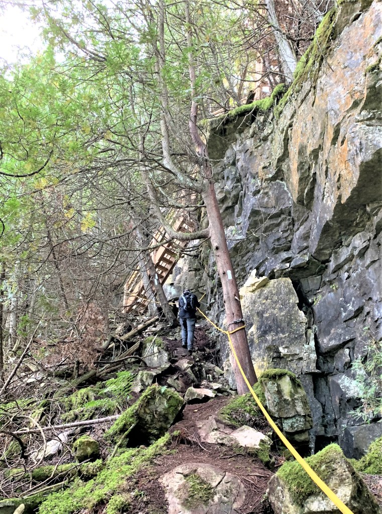 784. This is as close to the waterfront as the Trail gets. This area, now a nature reserve, was considered a critical acquisition by the Bruce Trail Conservancy, as it represents relatively unspoiled “deep woods,” and is thus an important wildlife habitat and refuge for uncommon species such as American redstarts and black-throated blue warblers, black bears and fishers. No, we didn’t see any of these creatures. Perhaps they didn’t fancy abseiling all the way down here on that green rope.