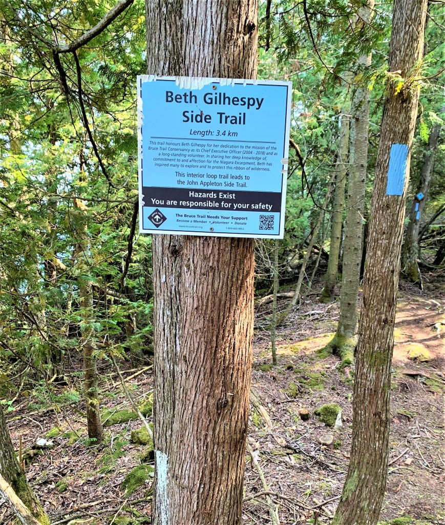 787. At the top of the staircase, there’s a new Side Trail dedicated to Beth Gilhespy. She was the highly successful chief executive officer of the Bruce Trail Conservancy for more than fourteen years (2004-18), during when, among other things, she helped raise $33 million in grants and donations, oversaw the protection of 152 properties comprising 6,500 acres of Escarpment land worth over $23 million, and initiated the change in policy that saw the Bruce Trail Association become the Bruce Trail Conservancy. An expert in the geology of the Escarpment, she’s currently the Executive Director at Toronto Zoo Wildlife Conservancy.