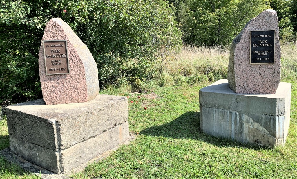 790. Two massive stone monuments on concrete pedestals greet us on the east side of Grey Road 9 near the turnoff to South Barrow Bay. But their plaques are frustratingly short on details about this pair of McIntyres, a father and son. A Google search reveals very little additional information: the monument (left) to pioneer Dan McIntyre was erected many years ago; the one to Jack McIntyre (right) was unveiled on 4 July 2010, and “Jackintyre,” as he was known, was a beloved local character and both he and his dog named “Stupid” are the subject of many amusing anecdotes. We’d love to hear some of these McIntyre anecdotes, so please, Barrow Bay, put them online! Doesn’t it seem a pity to go to all this trouble of public commemoration but not preserve in accessible form the reasons for it?