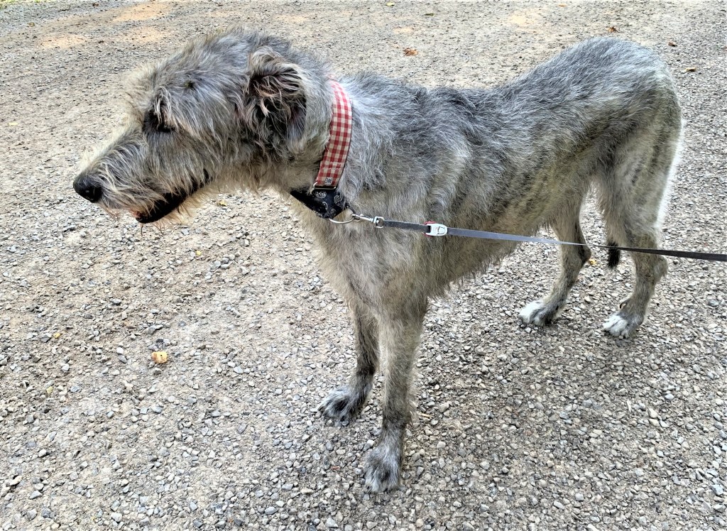793. At our end point on McKague Road, Freya, a magnificent Irish wolfhound, waits patiently with her owner. Irish wolfhounds are the tallest of all dog breeds and supposedly one of the oldest: the ancient Gaels called these dogs Cú Faoil (literally, “hound-wolf”), though their huge size is the result of more recent selective breeding. In spite of their formidable appearance and their wolf-killing reputation, Freya’s owner confirmed that Irish wolfhounds are of very mild domestic disposition: loyal, affectionate, intelligent, good with children, easygoing with other dogs. Their lifespan is, however, rather short at 6 to 8 years. The poem “Beth Gêlert” (ca. 1800) by William Robert Spencer, which retells a well-known Welsh legend about the titular wolfhound, gives an excellent and touching portrait of the character of these dogs. An excerpt: