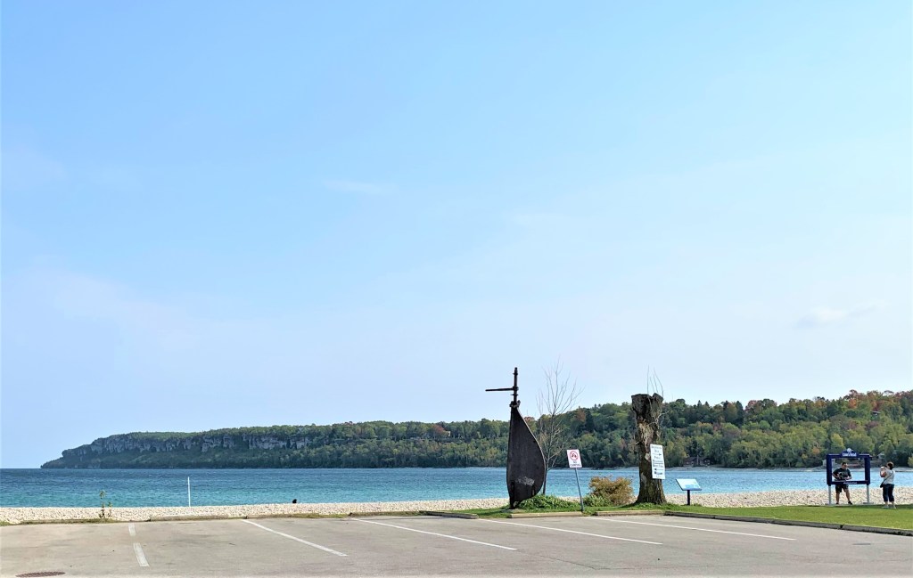 796. Lion’s Head was first called Point Hangcliff. Then in 1875 it was given its present name because the profile of the headland above reminded people of a lion’s head. Later still, according to some authorities, the leonine formation crumbled away into Georgian Bay. However, you can find recent photos online of a coastal formation that very much resembles a lion’s head, with foliage representing the mane. You can’t see this “lion” from here in the harbour, however. What you can do, like the couple at right, is photograph your own head in a frame that includes the putative lion.