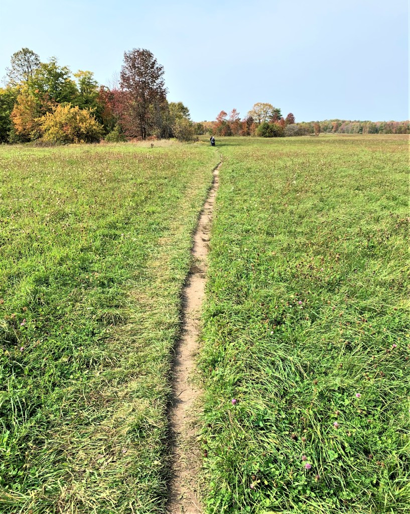 803. As we approach White Bluff, the Trail runs through the middle of an open field parallel to lakeside Whippoorwill Road.