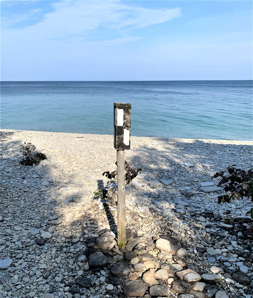 805. A survey monument disc next to the Trail, pinned into rock by Hewett & Milne, a company of surveyors in Owen Sound. Such benchmarks were set in the ground as hard evidence of legal boundaries, with the indirect aim of maintaining peace and order between neighbours. “Ontario regulations require that [survey monuments] be set by Ontario Land Surveyors (OLS) at all property corners and at regular intervals on boundaries. They may consist of, for example, 25 mm or 16 mm square steel bars, or 25 mm plastic bars, of up to 1.2 m length, set vertically in the ground with tops flush to or near grade; or they may be pins set in rock, or crosses cut in concrete.” As this disc states, it is a criminal offence to remove such monuments, though the law is rarely enforced.