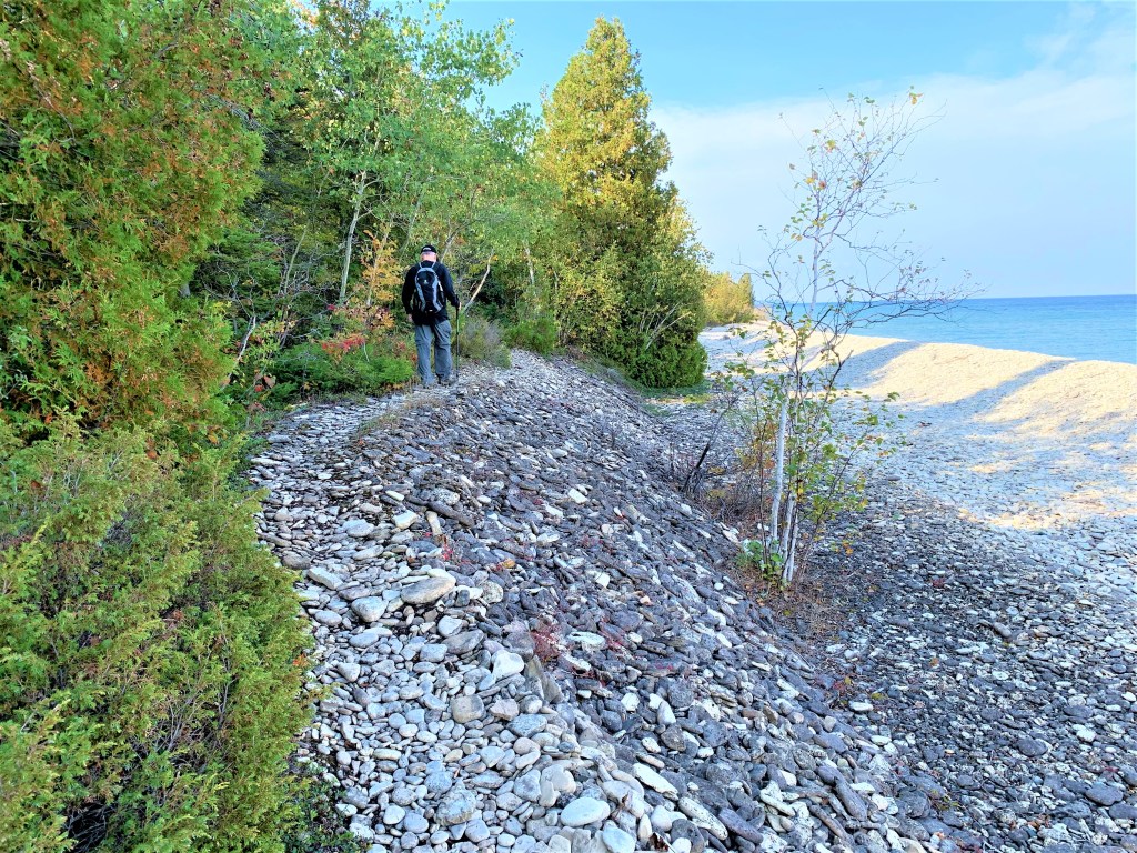 809. Here the Trail follows a raised platform of pebbles along the shoreline. There’s a dip down, then there’s a ridge of pebbles thrown up by wave action along the water’s edge.