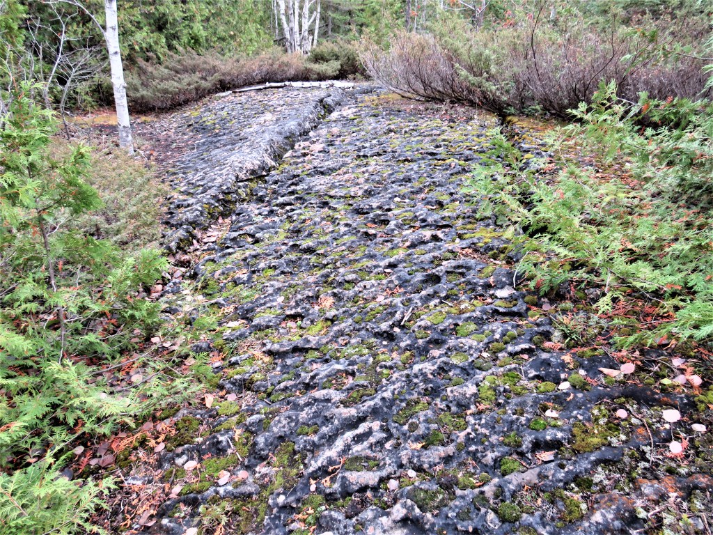 824. As we approach Cape Chin, the Trail is paved with dark, slanting, pitted dolomite. It’s not too bad a hiking surface when dry like today, but becomes very slippery when wet.