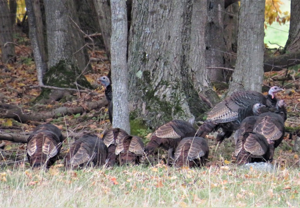 827A, B & C. As we emerge from the woods, we see a group of large birds foraging at the edge of a field. It’s a rafter of about a dozen wild turkeys. The ones with red wattles are males, known as toms; the hens are smaller and less colourful. The bird is a North American native, and the domestic Thanksgiving turkey was bred from these wild ancestors. It was the British who gave the bird its name, mistakenly associating its origin with the country of Turkey, from where merchants first exported the birds to the UK. By the 1940s wild turkeys had been almost extirpated from Canada by overhunting, but they were reintroduced during the 1980s and are now well reestablished.