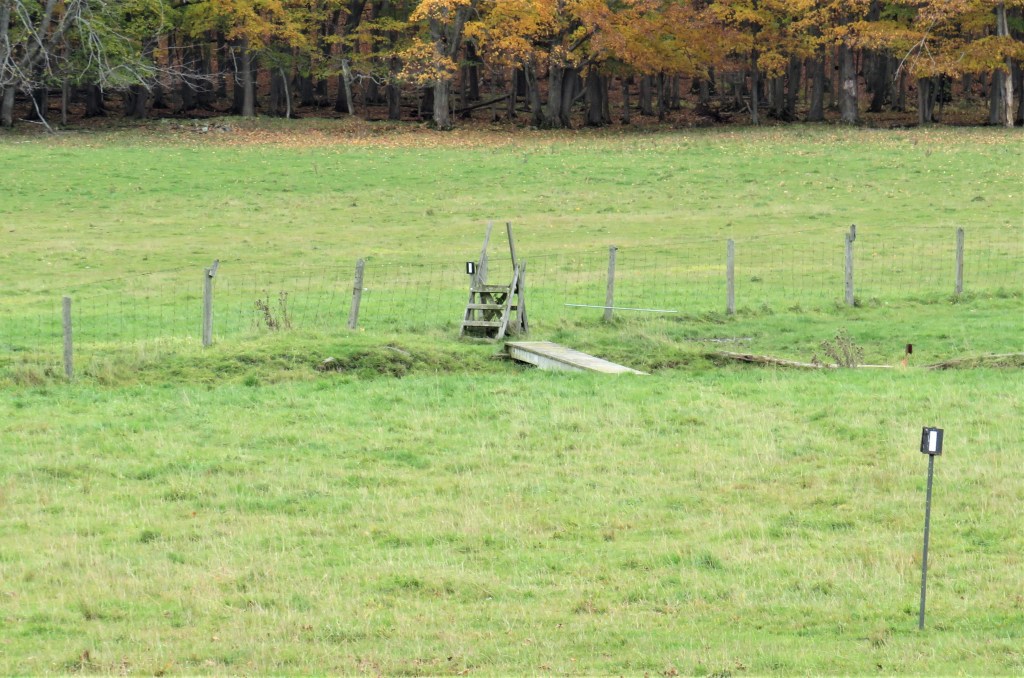 828. The Trail cuts across a sodden field, vaults over a classic stile …