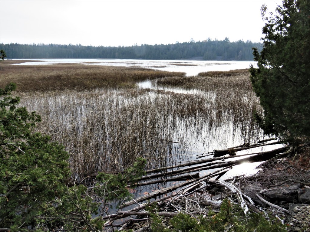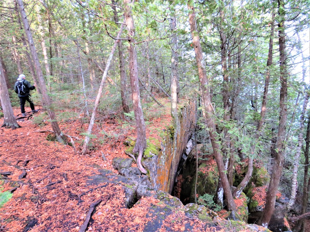 867. This penultimate one’s a monster, the hike that finally determines whether Mike and I are genuine End-to-End material or merely vainglorious tenderfeet who have bitten off more than we can chew. We’re facing a 16.8 km hike due west, mostly along the Escarpment above Georgian Bay, starting with 4.4 km of what remains of the “most challenging hiking along the entire length of the Bruce Trail.” Fortunately, the weather is unusually benign for early November. We begin on the same Side Trail as with Hike #68, turning left rather than right when we meet the Main Trail near the beach here at Halfway Dump. A National Park sign reminds us that the waters of the Bay are cold and deep, the waves are strong, the weather is changeable, and emergency services are far, far away. “We do not recommend swimming here,” it redundantly concludes, adding, “Tragically, someone dies almost every year along the Park’s Georgian Bay shoreline. It is usually a young man, 18-30 years old.” Well, that age range certainly rules us two out of danger … but then neither of us fancies a bracing dip this early in the morning.