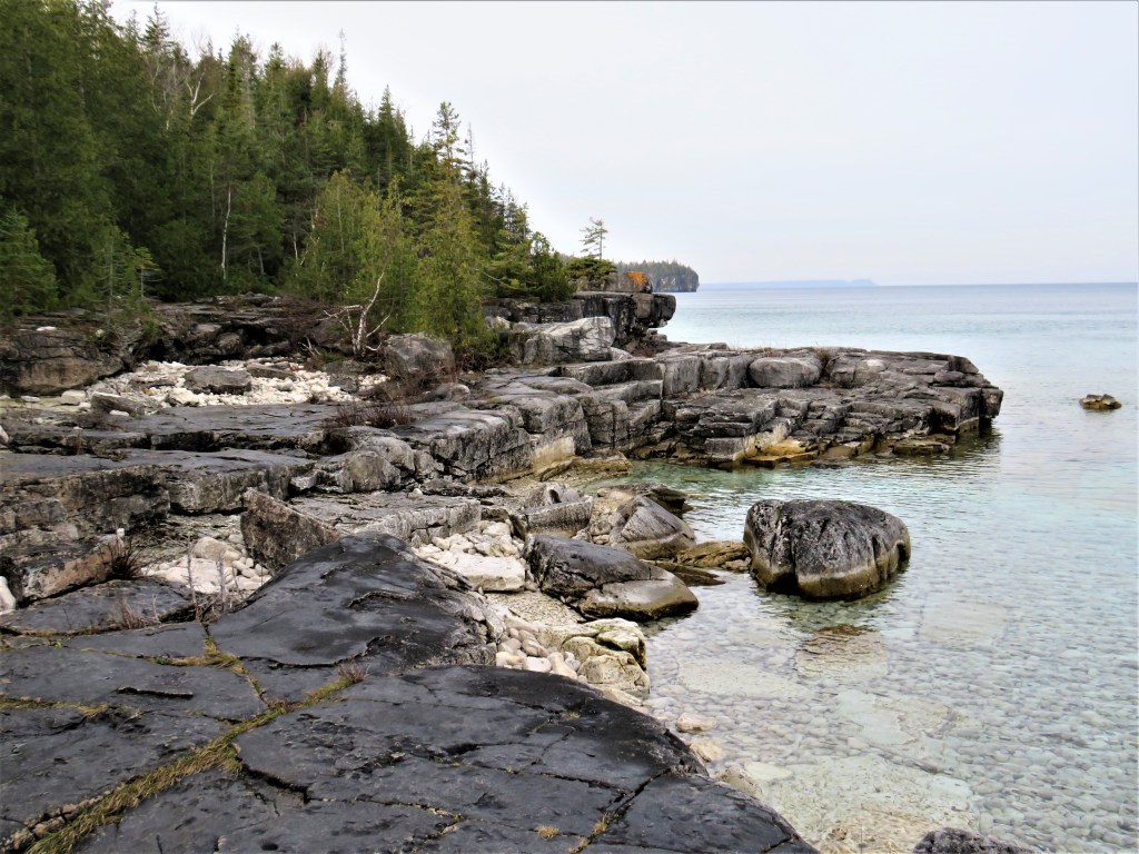 872. We’re back down at lake level again, Halfway Rock Point in the middle distance. I should have mentioned before now that whether up on the Escarpment or down by the lake, our hike along the eastern shore of the Northern Bruce Peninsula has almost always been accompanied by the sound of cobbles (the local word for pebbles or shingle) being churned by the waves. Not everyone likes this sound …