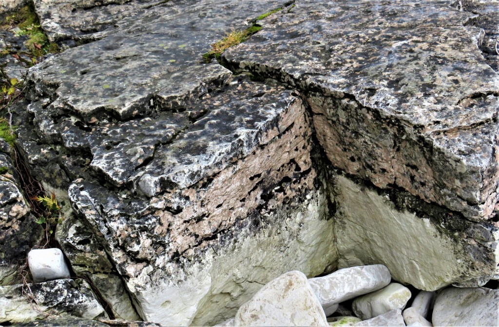 877. Honeycomb weathering in a dolomite cobble. No one is quite sure how these tafoni (pits) are formed in such rocks. They more commonly occur in seaside sandstone eroded by salt water.