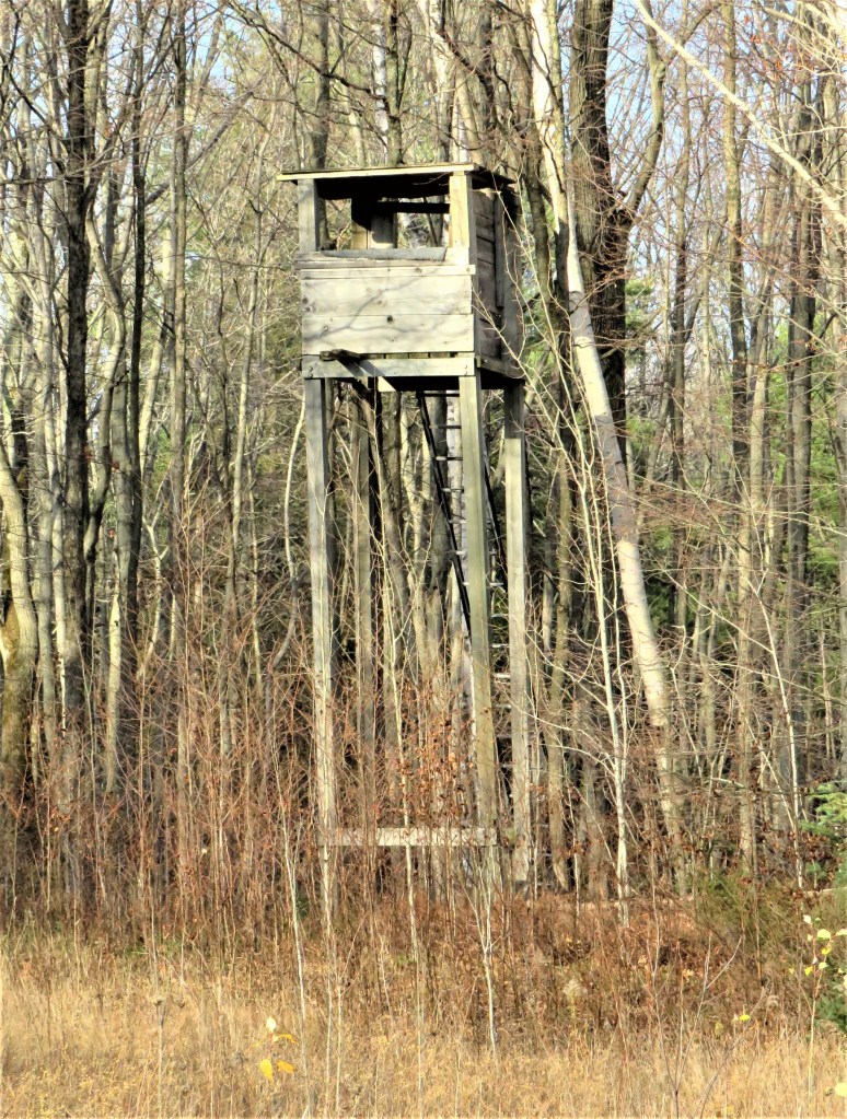 879. An elevated hunting blind towers on the edge of woods a little way inland from Driftwood Cove.