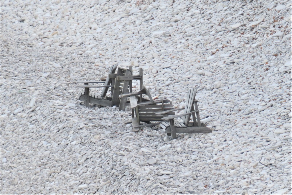 880A & B. (A) The beach at Driftwood Cove viewed from the west. The Rover Estate at Driftwood Cove was the largest body of private land on the Bruce Peninsula until 2018, when it was acquired by Parks Canada (with the assistance of the Bruce Trail Conservancy) for more than $20 million. The 1,342 hectare estate includes a 9,000 sq ft “cottage,” a 3,000 sq ft guesthouse, and a 1,000 sq ft stone boathouse. The new owners have not yet decided what to do with the property, which includes a lengthy winding single-track access road running all the way to Highway 6, so in the meantime the Trail keeps its distance from both the buildings and shoreline. (B) The camera’s zoom reveals the objects on the distant beach to be four Adirondack chairs in a state of disarray. The chairs may be the legacy of an open house held in May 2019 when 270 members of the public toured the buildings on the property and came up with a variety of suggestions about what to do with them. They included: tearing them down and returning the site to nature; using them as the base for a Banff-style fine arts school or a science research station; or turning them into a visitor centre showcasing local First Nations heritage.