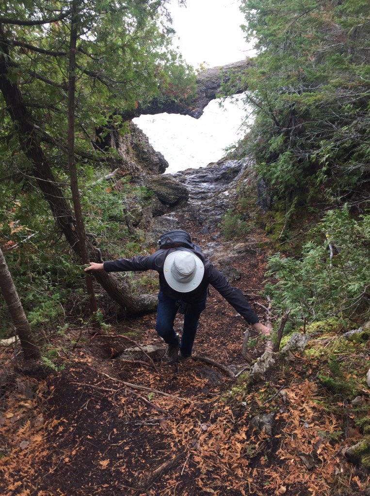885A & B. Soon the Trail is back for a short spell on the lakeshore at Dunks Bay. (A) Mike takes a photo of this little natural bridge and then (B) captures me scrambling up a steep section of Trail away from the shore.