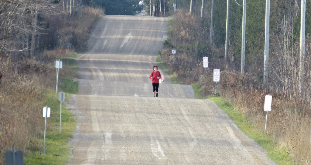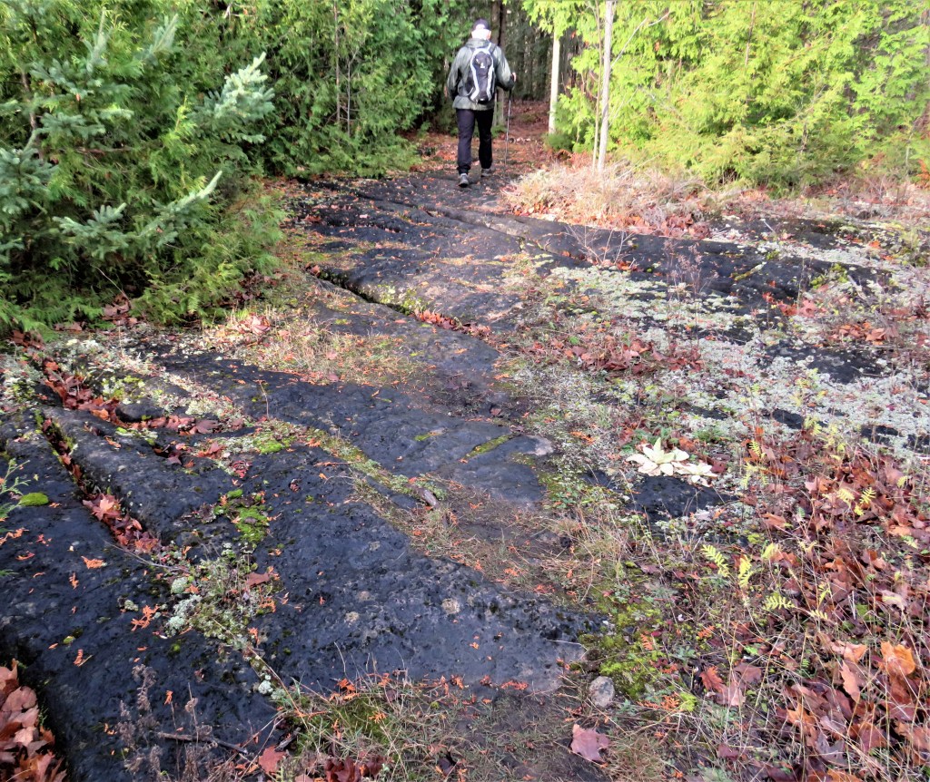 883A & B. Our final hike takes place on a Saturday morning unusually mild and sunny for early November. It’s only 8.1 km from here on Little Cove Road to the cairn marking the Trail’s northern terminus in Tobermory, but it turns out not to be not quite the simple walk in the park that we had anticipated. Rather, this hike is a condensed composite of almost every kind of terrain that the Trail has presented us with. The easiest part comes first: just over one km along Little Cove Road itself. (A) Starting out, we’re curious about that red dot in the distance, which eventually resolves itself into (B) a woman doing energetic jogging exercises, including running backwards. There’s a white dog with her, and she’s loudly and continually urging it to keep up with her, but, amusingly, it seems completely unwilling to do so, trotting along at its own relaxed pace several meters behind her.
