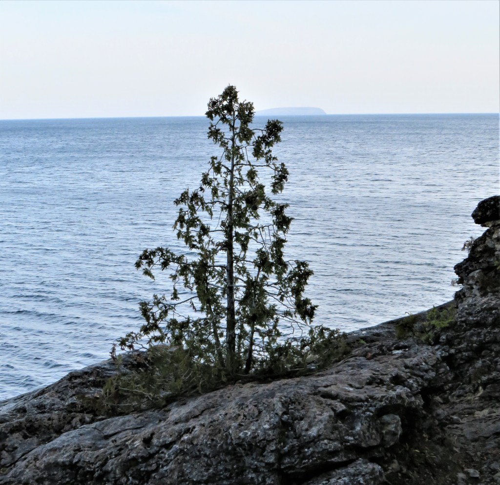 886A & B. The following section of less than 1 km is one of the trickiest we have encountered. It’s as if the Trail was saying, Don’t imagine you’re out of the woods yet. As the blaze in (A) indicates, the Trail crosses this bare, downward sloping bedrock, which must be a nightmare after rain. (B) This little pine is doing its best “Group of Seven” imitation, with Bear’s Rump Island on the horizon behind it.