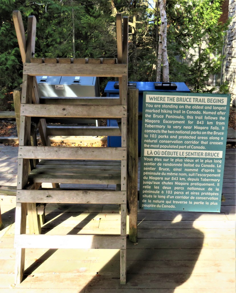 887A & B. Soon enough we’re passing by the Bruce Peninsula National Park Visitor Centre, closed for the season. Still open is (A) a 20-metre-tall viewing tower that gives spectacular panoramas of the area, but frankly, we’re just too weary to haul our asses to the top. And there’s (B) a stile over nothing next to an information board that claims, falsely in both official languages, to be where the Bruce Trail begins. We know exactly where the Trail begins (or from our perspective, ends), as we saw the precise location from where we stayed overnight …