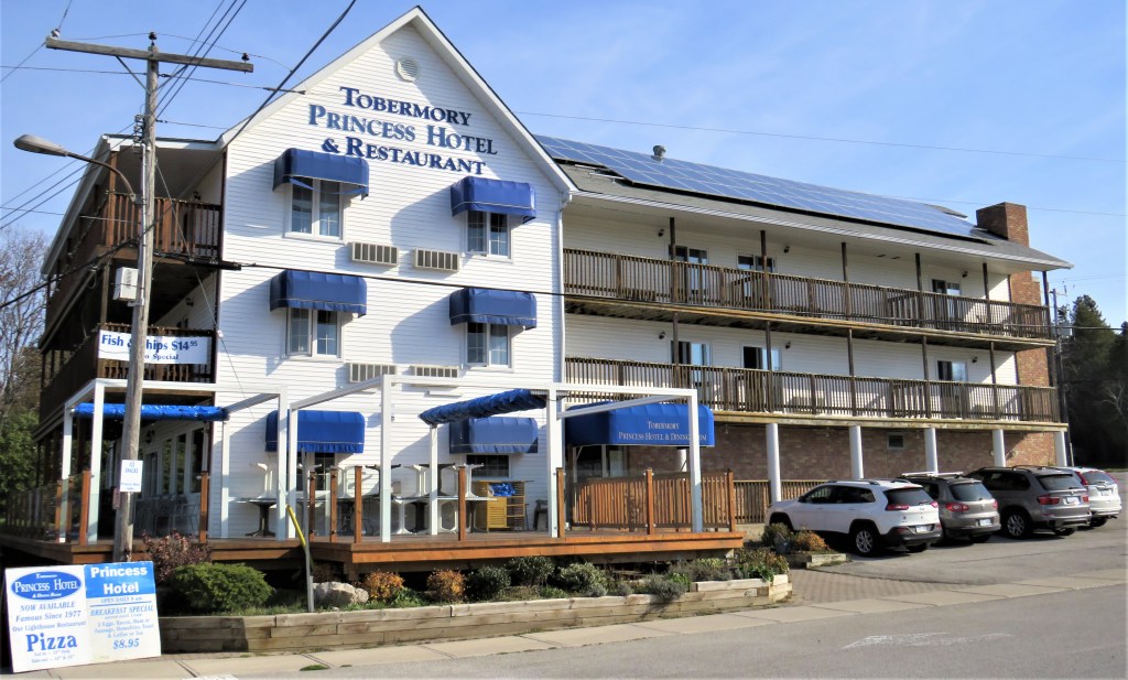 888. … namely, the Princess Hotel, one of only two hostelries open in pandemic Tobermory in early November, and just about the only place in town with an operating restaurant. The Princess opened in the early 1900s as the Matheson House, a boarding house. Later it became the Davey Hotel, and then The George’n (Georgian, get it?), catering to scuba diving groups who flock to Tobermory as the base for exploring the wrecked ships in Fathom Five National Marine Park, just offshore. There are 18 wrecks in the Marine Park, the first and only such underwater park in Canada. The Tobermory Princess Hotel acquired its current name and function when the present owners took it over in the early 1990s.