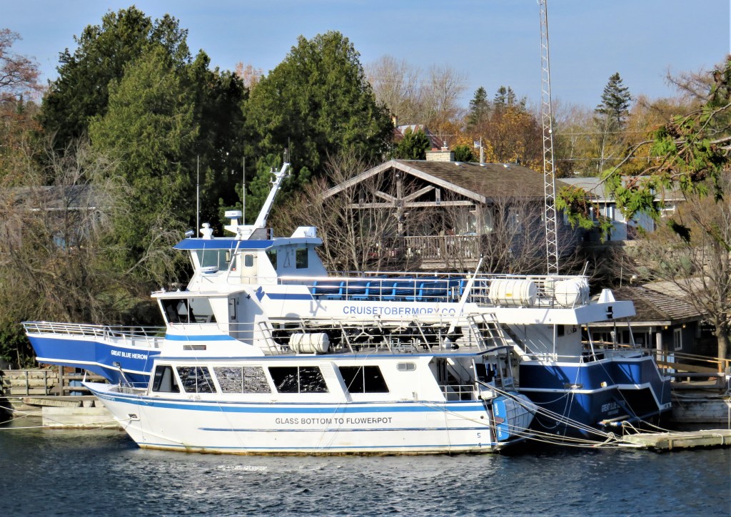 889. The Princess Hotel overlooks Little Tub Harbour. Guess what Tobermory’s other, larger harbour is called.* The “Glass Bottom to Flowerpot” vessel in the foreground takes seasonal tourists to Flowerpot Island 6.5 km offshore to see the flowerpot geological formation (see #836) that gives the island its name. The glass bottom of both the smaller vessel and the Great Blue Heron behind it allows visitors to see two shipwrecks through the lucid waters of Georgian Bay: the Sweepstakes, a Great Lakes schooner that hit a rock and foundered on 23 August 1885, and the City of Grand Rapids, a double-decked steamer, that went down on 29 October 1907 as a result of a fire on board. Both wrecks are in *Big Tub Harbour just west of here. Tobermory itself was named in 1882 after the fishing port on the Scottish Island of Mull; the name comes from Scottish Gaelic Tobar Mhoire, meaning “The Well of Mary.” Once there were as many as forty fishing boats based in Tobermory’s two harbours, and during the later nineteenth century there were five large lumber mills in the village, processing pine, maple, ash, elm and birch. These days, Tobermory’s main industry is tourism. After you’ve taken the boat tours and checked out the wrecks and the coastal formations, you can put your car on the ferry for a 2.5 hour ride to Manitoulin Island, the world’s largest freshwater island, then drive on into Northern Ontario. But out of season, as now in November, the tip of the Bruce Peninsula is a dead end and Tobermory is almost a ghost town.