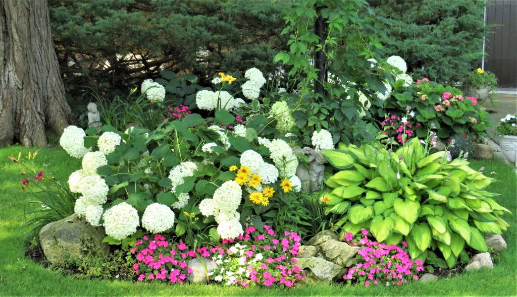 110. A colourful display of the low-maintenance flora typically featured in the front gardens of the affluent homes on the Parkway. Hydrangeas, hostas, tickseeds, petunias, and day lilies figure prominently.