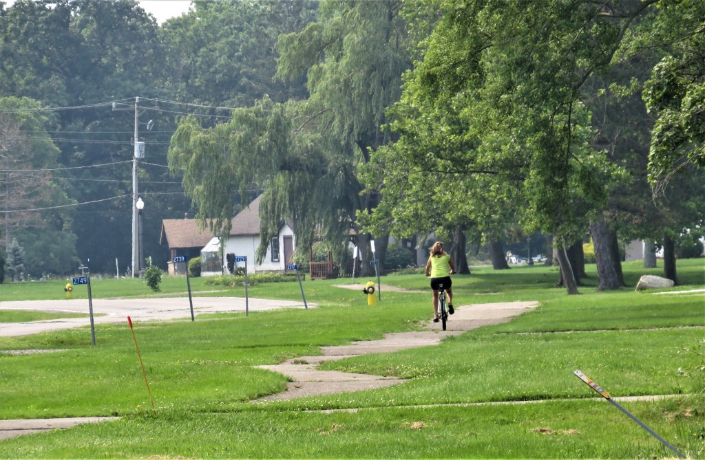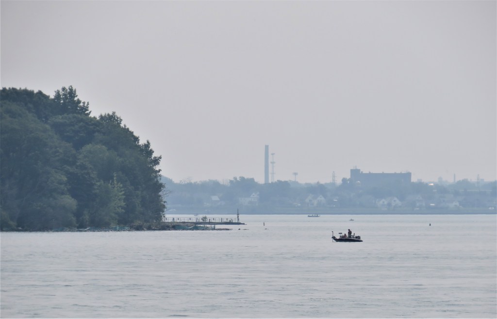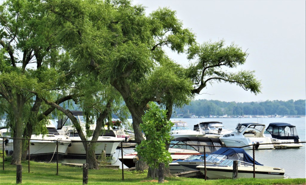 107. Today’s hike takes us almost 10 km southeast, from Black Creek near the junction of the Niagara Parkway with Netherby Road, to Frenchman’s Creek near the northern edge of Fort Erie. Near the end of the hike, we pass the southernmost point of Grand Island, where the Niagara River divides into two branches on its way downstream. And then the industrial suburbs of the city of Buffalo, New York come into view across the River. The Canadian shore is, with the occasional exception, affluent and suburban and this section of the Parkway is very lightly trafficked.