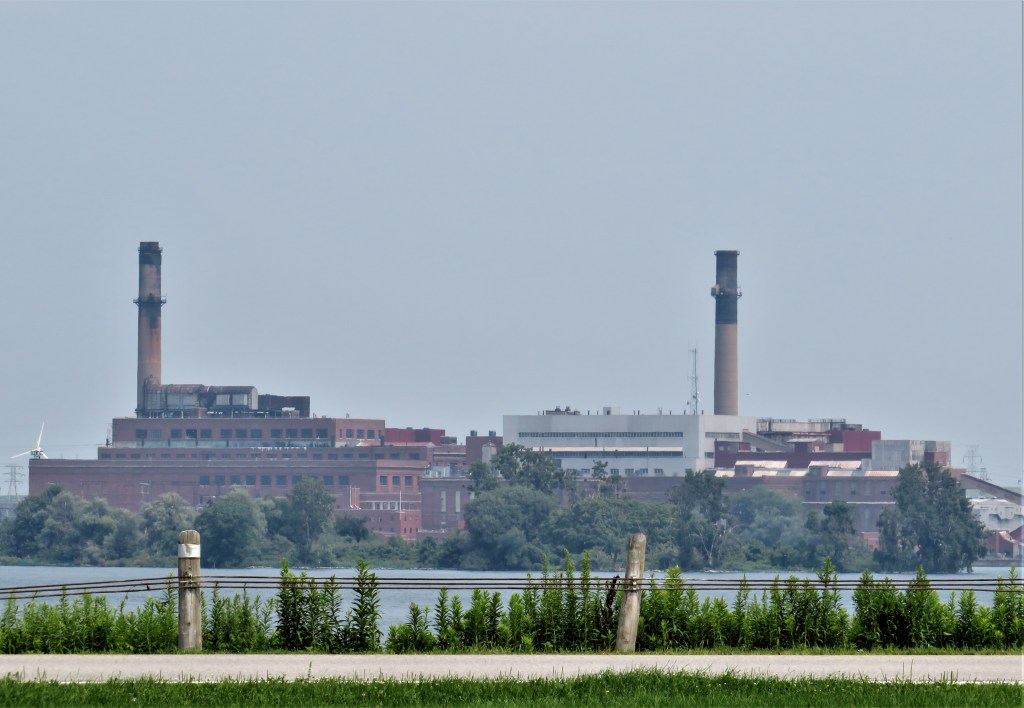 125. The former Charles R. Huntley Generating Station looms across the Niagara River in the town of Tonawanda, NY, a blue-collar suburb of Buffalo. It was a coal-fired 780 MW facility, originally built in 1916 then enlarged between 1940-50. The worst air and water polluter in Erie County, as well as the largest contributor to the local tax base, it was closed down by current owners NRG Energy on 1 March 2016. The enormous size of its adjacent coal storage yard can be seen on the satellite view courtesy of Google Maps. (Why a coal-fired power station was needed on the bank of a river famous for its hydroelectric generating capacity is a whole other story.) Possibilities for reuse of the site were recently debated in Tonawanda: they included a bioenergy plant, an industrial heritage museum, and green space, as (unlike here on the Canadian side) public access to Tonawanda’s six miles of riverbank is limited. An eagerly anticipated sale of the property fell through in 2020, and the owners are currently inviting new proposals.