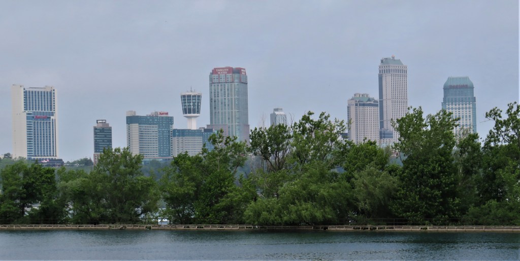 85. Downstream, a large bridge becomes visible in the distance. It’s the toll bridge of US Interstate I-190 connecting Niagara Falls, NY to Grand Island, NY, a large island (73.2 km2, pop. 20,000) that divides the Niagara River into two widely separated branches. Grand Island, entirely within US territory, is larger (though somewhat less crowded) than Manhattan (59.1 km2), and is not connected by bridge to the Canadian shore.