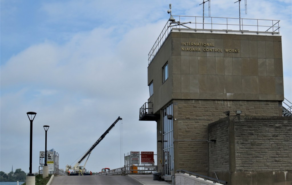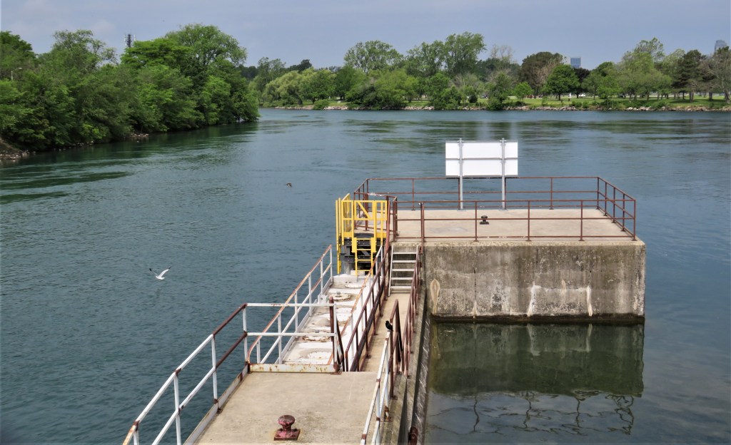 81. Ahead we encounter what looks like an uncompleted bridge (above) that terminates at the midriver border between Canada and the USA. Part of the International Niagara Control Works (completed 1954), it’s not a bridge but a partial dam containing a series of 18 sluice gates with a roadway (above) on top. The sluices are used to control the rate of flow of water over the Falls, and consequently also the flow through the artificial channels to the various hydroelectric facilities downstream in both Canada and the USA. The 1950 Treaty mentioned on the plaque (above) is very specific in its aim to preserve the majesty of Niagara Falls during daylight hours, as both countries reap the economic benefits of the appeal of the Falls to tourists: pre-Covid, the Canadian side saw about 14 million annual visitors, the American more than 9 million. According to the Treaty, the waterflow over the Falls should be no less than 2,832 cubic metres per second from 8:00 am – 10:00 pm between 1 April and 15 September, and from 8:00 am – 8:00 pm between 16 September and 31 October. The flow should be no less than half that rate (1,416 m3/sec) at any other time.