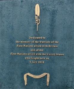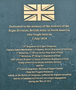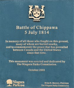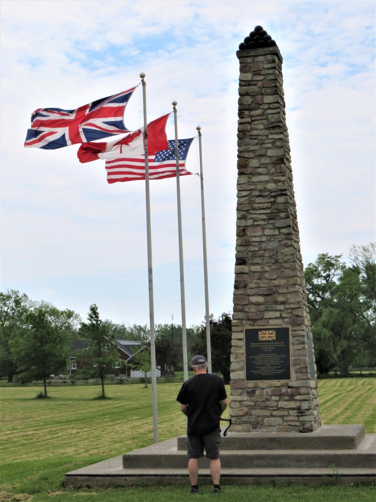86. Three flags over a mown field commemorate the Battle of Chippawa on 5 July 1814, fought during the Niagara Campaign late in the War of 1812. Two days earlier, about 2,700 US troops (the Left Division of the Army of the North) under Major-General Jacob Jennings Brown had crossed the Niagara River from Buffalo and easily captured Fort Erie, about 25 km south of here. Joined by about 1,300 volunteers and First Nations warriors, the Americans then headed north under Brigadier-General Winfield Scott with the aim of securing the crossing over the Chippawa (now the Welland) River. But the Right Division of the British Army of Upper Canada, under Major-General Phineas Riall had partially destroyed the bridge and had dug in 2,000 men, including about 300 First Nations allies, on the north bank. As he crossed the Chippawa River to engage them, Riall was confident that his troops were greatly superior to what he assumed were poorly-trained US militia. But the grey-coated Americans were actually well-trained regular troops and outnumbered the British. On this field on Samuel Street’s farm between the village of Chippawa and Street’s (now Ussher’s) Creek the Americans forced the British to retreat back to the north bank of the Chippawa River and to destroy the bridge completely to stop the US advance. Over 100 British troops were killed and about 319 wounded on this battlefield, compared to 58 Americans killed and about 250 wounded. Next day, the Americans buried the dead on the battlefield itself. It was the first time since Independence that an American army had won a battle against a force of roughly the same size, and Winfield Scott, whose reputation was made on this field, would later become the top-ranked general in the US army. However, on 25 July, less than three weeks after Chippawa, the Americans were held to a stalemate not far from here at Lundy’s Lane, the bloodiest battle ever on Canadian soil, where Winfield Scott was badly wounded. From then on the British held the strategic advantage and the War of 1812 would end in 1814 with the territorial status quo ante bellum more or less intact. From a contemporary Canadian perspective the Chippawa monument commemorates a defeat, though the four plaques on the column make it clear that what’s to be mourned is the loss of life on both sides, while what’s to be celebrated are the more than 200 subsequent years of peace between Canada and the USA.