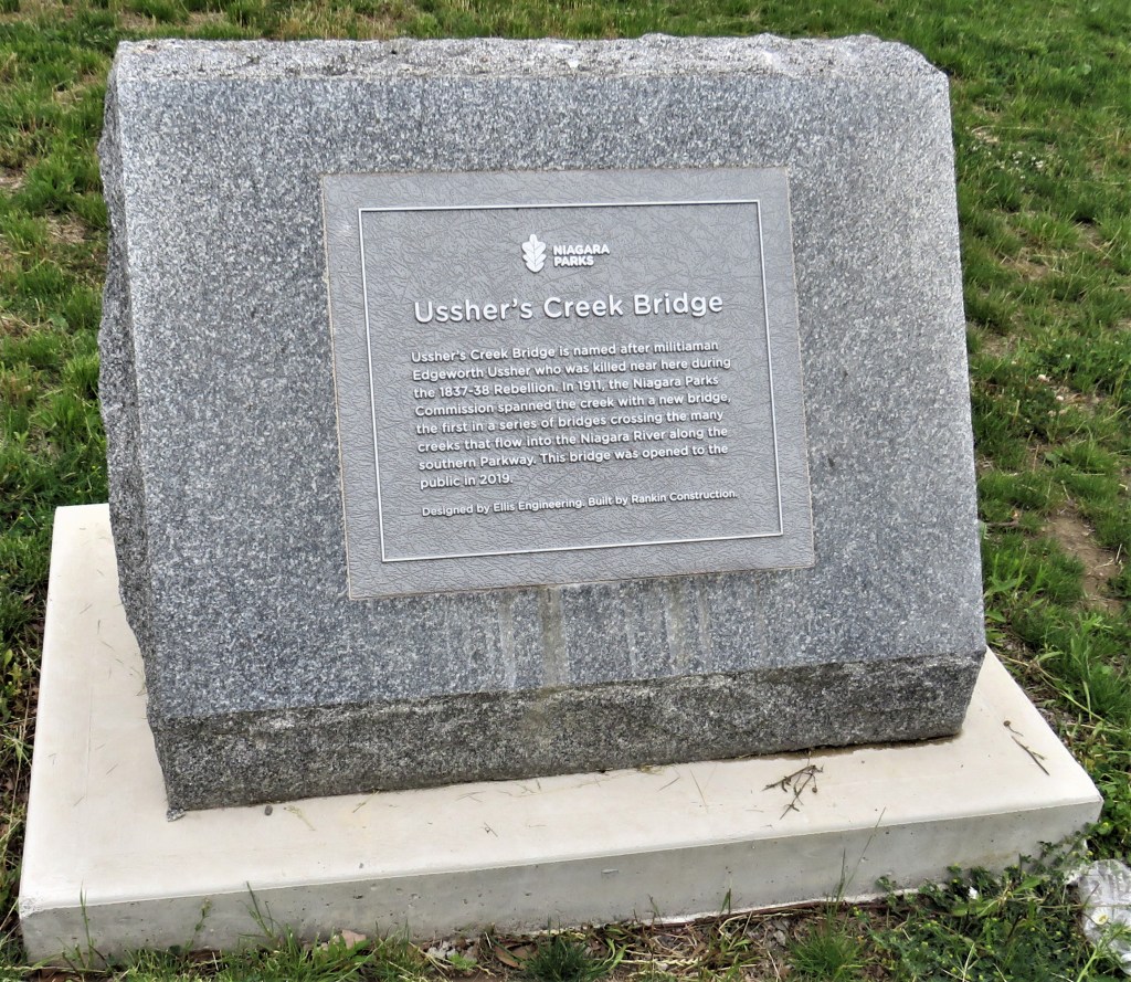 88. The Niagara Parkway crosses this small creek (above) on a new bridge (2018). The creek is labelled “Street’s Creek” on the 1869 Battlefield map above. But a historical marker (right) on the Parkway now calls it Ussher’s Creek. (Google Maps still labels it “Streets [sic] Creek,” showing once again the persistence of original names.) The renaming, possibly in 1911, was intended to memorialize the militiaman Edgeworth Ussher (c. 1804-38) who, the marker reticently notes, “was killed near here during the 1837-38 Rebellion.” The story behind Ussher’s death requires rather more elaboration. On 14 December 1837, William Lyon Mackenzie (see #29 above) and about 200 of his followers had retreated to Navy Island (see #89 below) after his failed rebellion against the Upper Canada status quo. There Mackenzie established the short-lived “Republic of Canada,” an action that had the sympathy of many Americans. An American steamship, the Caroline, was used to supply the Republic of Canada from the US shore. On 29 December 1837, Ussher, a captain in the Lincoln Militia, was one of a small British commando-style force who crossed to the American side of the Niagara River, killed a watchman, seized the Caroline, set it afire and then allowed the current to sweep it over Niagara Falls (above). The British justified their action as the destruction of a vessel supporting a traitor. But Americans were outraged at the violation of their territory and property, and to whip up anti-British feeling some US newspapers falsely reported that the entire crew of the Caroline had been murdered. Almost a year later, on 16 November 1838, Ussher was shot to death on the front step of his house near Chippawa village. Charged with his murder was Benjamin Lett (1813-58), who avoided prosecution by fleeing to the USA. Lett’s motive seems to have been revenge for Ussher’s part in the Caroline affair. Several further raids in reprisal for the Caroline occurred in 1838, including the seizure and burning on 28 May of the British steamer Sir Robert Peel on the US side of the St. Lawrence River. The assassination of Ussher took part in this context of great tension between the British and Americans on the Niagara border. Benjamin Lett, incidentally, was almost certainly the “veteran of the 1837 rebellion” (see #33 above) responsible for the bombing of the Isaac Brock column in Queenston in 1840. Lett, Irish-born, would have a long history of anti-British terrorism but usually managed to escape judicial punishment, until eventually his actions became too extreme for the American authorities, who imprisoned him at Auburn, NY. Pardoned, he would later die in Milwaukee from strychnine poisoning, possibly at the vengeful hands of Canadian agents.