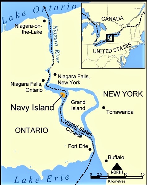 89. (Above) Part of wooded Navy Island, Ontario is at right, with the I-190 bridge from the mainland over to much larger Grand Island, New York visible in the left background. Navy Island’s role in Canadian history is short but dramatic. The British established a Royal Naval Shipyard here in the later 18th century. There was a blockhouse and storehouse for British troops on the Island during the War of 1812. William Lyon Mackenzie proclaimed it the “Republic of Canada” in December 1837 but was forced to abandon it and retreat to the United States in January 1838. From 1875, the Queens Hotel served as a Navy Island summer resort, but it burned down in 1910. Remarkably, in 1945, Navy Island was proposed as the site for the new headquarters of the United Nations! (New York City subsequently won out.) About 1.2 sq. km in area, Navy Island is currently closed to the public, uninhabited, and without facilities. A lost opportunity … but for what?