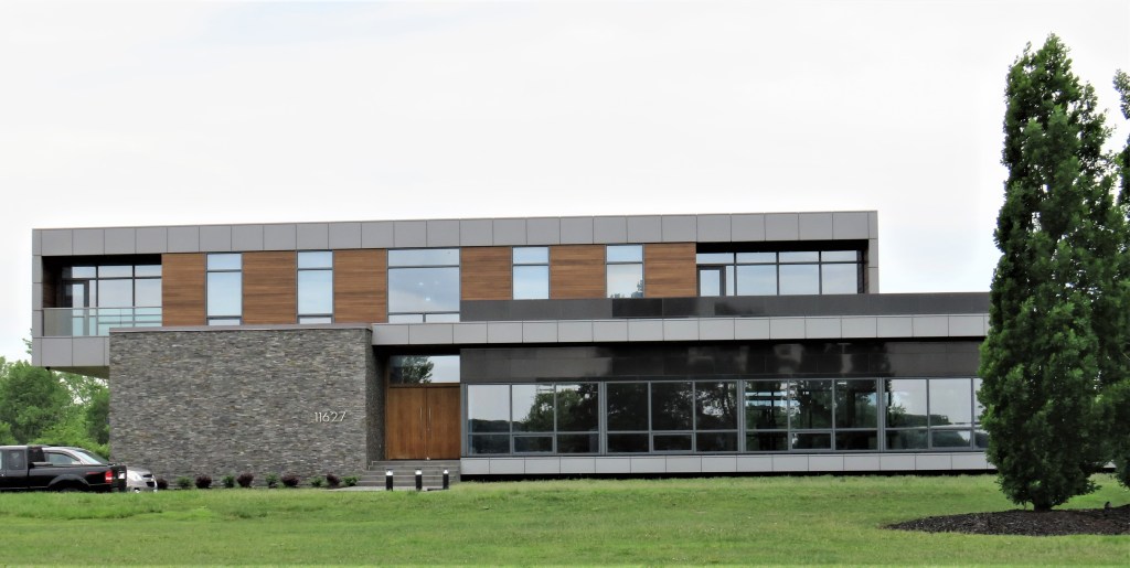 98. This might be a new branch library or elementary school, but actually it’s “Riverhouse Niagara” (2009), a 4,700 sq. ft. single family home with 1,200 sq. ft. covered terrace at 11627 Niagara Parkway. It was designed by Zerafa Studio, a design consultancy based in New York City, and its sleek lines are refreshing after all the neighbouring McMansions. But would you want to live in it? The architects speak of trying to “find a balance between the relative transparency encouraged by the views and the privacy concerns of the owners.” But if you have have “privacy concerns,” it’s surely best not to live in a house with a frontage that contains more glass than the combination of Western red cedar, steel, and charcoal quartzite comprising the rest of its facade. Photographs of its exterior and interior can be found here.
