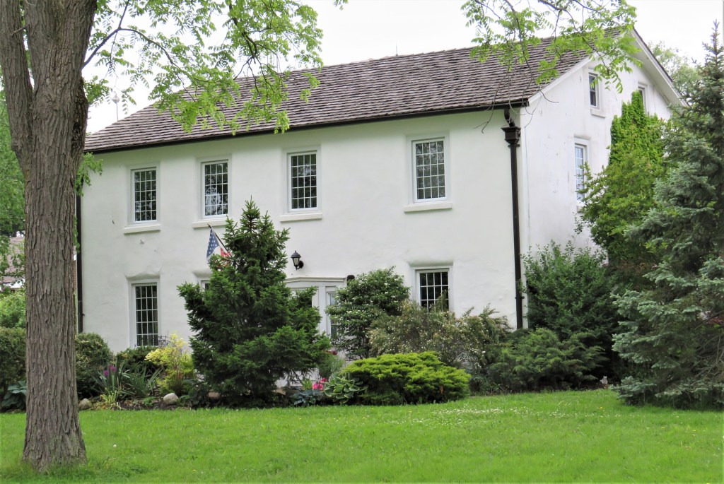 100. The Danner-Sherk House (built c. 1805) at 12459 Niagara River Parkway is one of the few surviving Loyalist houses in Georgian style in the area. Underneath that white stucco are coursed rubble limestone walls, the solidity of which has probably contributed to the house’s survival for more than two turbulent centuries. It was built by Ulrich Strickler (1767-1838) and his wife Magdalena (Miller) (1775-1863), Mennonites originally from Pennsylvania, who ran a successful farm here. (Pennsylvania had been founded in 1681 by the Quaker William Penn on the principle of religious tolerance for all believers, hence the large number of German-speaking nonconformists who emigrated there.) During the War of 1812, Strickler’s crops and goods were first seized by American, then by British troops. Magdalena’s brother would submit claims for 20 gallons of whiskey taken by the British in November 1812; horses, grain, and a rifle taken by the Americans in 1813-14; five buildings damaged by the Americans in 1814; and a large quantity of food supplied to the British army. This house was possibly the only one in the area not set on fire during the conflict. In 1816 the Stricklers moved back to the USA and the house was bought for £1,000 by the long-lived Joseph Danner (1774-1870) a Pennsylvanian-born Quaker who farmed here until 1847. He and his wife Rebecca built a stone wing at the rear (c. 1820) that has a “loom room” (for weaving) on the upper floor. During the 1837-38 Mackenzie Rebellion, the house was again occupied by British troops. In April 1847 Danner sold the property for £1,250 to Jacob Wenzenried and George Wulz, trustees for The Community of True Inspiration, a.k.a. the Ebenezers (see #102 below). They sold the southern half of the property in 1855 to dairy farmers Elias Sherk (1825-93) and his wife Mary (Zavitz) (1826-81), who operated a cheese factory on the property and raised thirteen children in the house. It remained with the Sherk family until 1926, then was bought by John MacTaggart (d. 1969), a director of Louis Tussaud’s Waxworks (still operating in Niagara Falls). His widow Mae lived in the house till her death in 1993. The house received a heritage designation in 2000, and until the recent pandemic it was operated as Danner House, an upscale bed and breakfast establishment. So at least till 1926, the house’s ownership presents a cross-section of radical nonconformist settlement here on the Niagara River.
