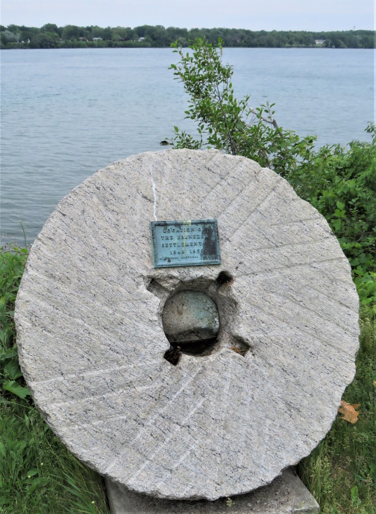 102. The true story differs somewhat from the details on the plaque. The Ebenezers, or The Community of True Inspiration, were the first 800 members of a chiefly German radical Pietist (Protestant) sect who, to avoid persecution in their homelands, moved to New York State in 1843, having purchased 5,000 acres of an Indian Reservation in what is now West Seneca, a suburb of Buffalo. “Ebenezer,” which derives from a Hebrew phrase meaning “stone of help” and implies gratitude for divine assistance, alludes to an episode in the Old Testament (1 Samuel 7) when the Israelites defeated the Philistines in battle. The Inspirationalists, as the Ebenezers were also known, were skilled agriculturalists, textile manufacturers, and craftspeople, and soon prospered in the New World: their houses had no kitchens as they ate communally, men and women sitting apart. The millstone (above) on display by the riverbank is a suitable testament to their ethos of hard work. “In less than a year from the founding of Ebenezer [in West Seneca] two more villages were laid out on either side of the first…. And when a family of ‘Pennsylvania Dutch’ [i.e., settlers of German origin] joined the Community from Canada, thus bringing to the Community a fine tract of Canadian timber land, two villages were located on the Canada side of the river and were named Canada Ebenezer and Kenneberg, respectively. Each village had its store, its school, and its church. There were sawmills, woolen mills, flour mills, and numerous other branches of industry, giving employment to all according to their talents and inclination”: Bertha M.H. Shambaugh, Amana, The Community of True Inspiration (State Historical Society of Iowa, 1908), p. 61. By 1854 the city of Buffalo had expanded, threatening the rural peace and sanctity of the Inspirationalist lifestyle. So they upped stakes and went west to the new state of Iowa, and there they founded the Amana settlement, which still exists as a tourist site. The Amana in Iowa were prosperous and creative, one of their legacies being the Amana brand of appliances, now owned by the Whirlpool Corporation: it was a pioneer in refrigeration and microwave appliances. Few realize that like “Ebenezer,” “Amana,” is a biblical proper name: a mountain in Lebanon representing spiritual constancy. So, the plaque above is chiefly incorrect in that the Canadian Ebenezer site, a mere 228 acres, was a minor adjunct to the main settlement at West Seneca, and almost certainly never included anything close to 800 people. But it too disappeared in 1854 when all the Ebenezers moved to Iowa. There isn’t even a surviving graveyard, as the Inspirationists did not believe in any markers more lasting than wooden crosses.