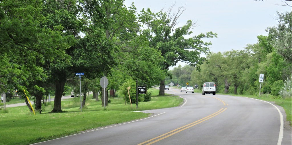 103. The Niagara Parkway at its junction with Sherk Road. This road’s name commemorates the family of Johannes Sherk (formerly Schürch, 1745-1837) and his wife Barbara (Berg) (c. 1750-1824), Mennonites born in the Canton of Bern, Switzerland who had emigrated to Lancaster County, Pennsylvania. The Sherks came to Upper Canada in about 1795 with eight children and settled not far from here in the village of Snyder (known then as “New Germany”). Sherk descendants owned the Danner House (see #100 above) for many years.