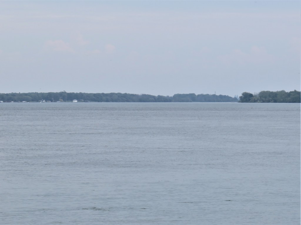 106. The scene upstream across a broad reach of the River near our hike’s end point at Netherby Road. At the lowest dip in the vegetation on the horizon at right can just be seen the twin towers of the administration building (1870) of the former psychiatric hospital, the Richardson Olmsted complex, on Forest Avenue in north Buffalo near the State University (SUNY) campus. The towers are about 15 km away as the crow flies.