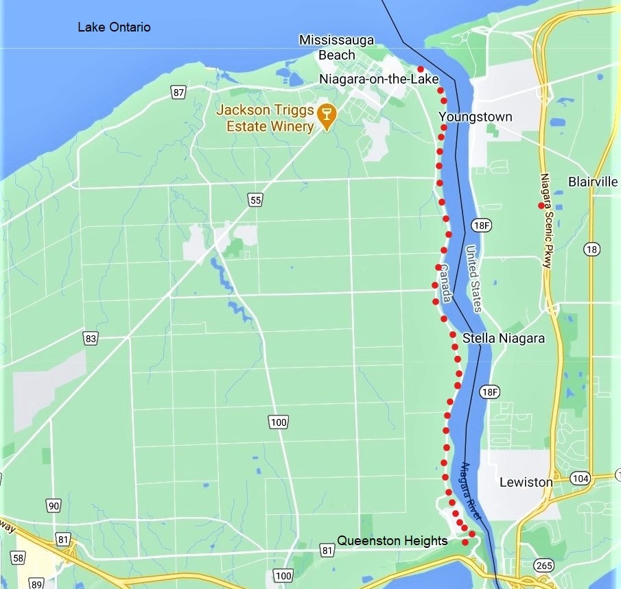 3. Our first leg (the red dotted line) will take us from the charming town of Niagara-on-the-Lake (pop. 17,500), known for its Shaw Festival theatres, past several historic riverside sites, through the village of Queenston, as far as the monument to Laura Secord on Queenston Heights.