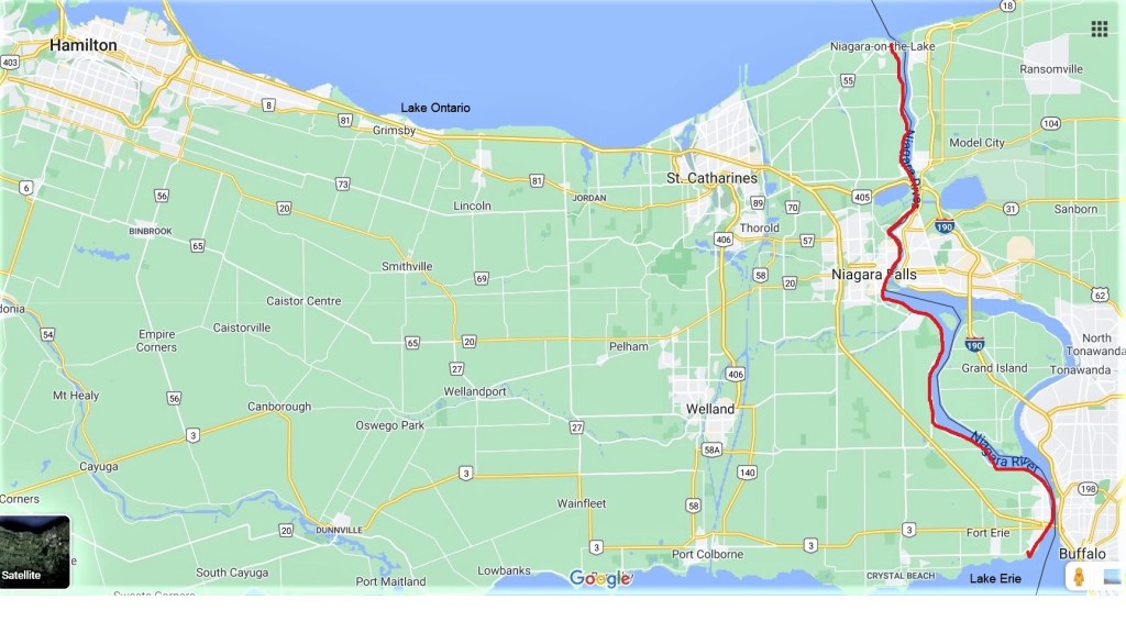 2. No, we have no intention of attempting to complete all 27,000 km of the Great Trail. It’s 30 times the length of the Bruce Trail, so it would take us about 75 years at our usual pace. As our current combined age is 141 years, I don’t need to spell out why a Great Trail End-to-End would be a bridge too far. What we plan to do is explore some local Great Trail highlights. One of the more appealing sections begins in Niagara-on-the-Lake and follows the Niagara River south (that is, upstream) via Niagara Falls to Fort Erie. We’ll follow this trail for more than 50 km, starting at Ricardo Street just east of downtown Niagara-on-the-Lake and finishing on the shore of Lake Erie. See the red line on the map above.