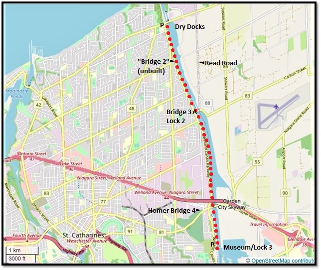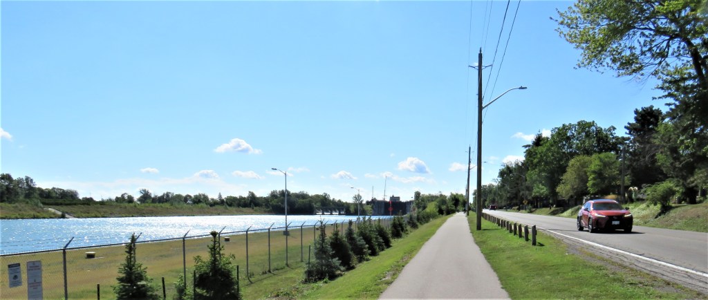 87. This hike takes us from the free P at Charles A. Ansell Park, where we ended the previous hike, south along the Welland Canal Trail to the free P at St. Catharines Museum. Marked by the red dots on the map above, it’s about 7.1 km one way. If you park a car at each end, it’s a very pleasant stroll along a paved multiuse trail segregated from traffic. Be aware, though, that speeding cyclists don’t always alert pedestrians to their presence when passing from behind!