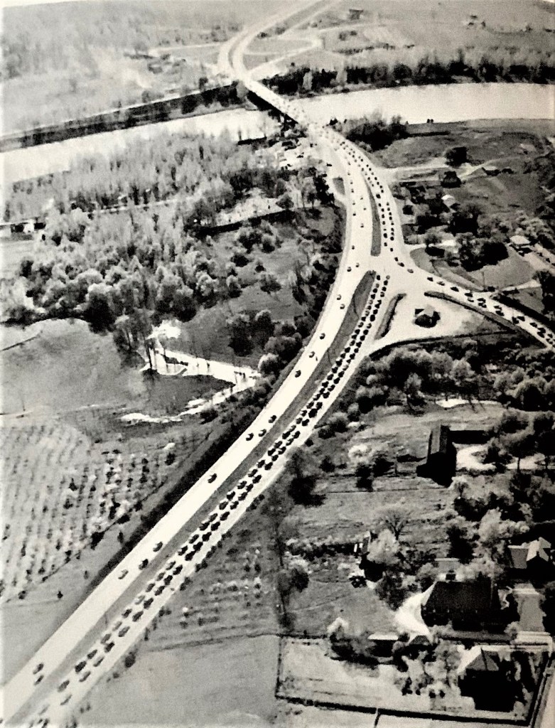 (Bottom) An aerial photo of Homer in 1950, before the construction of the Garden City Skyway, when the QEW used Bridge 4 to cross the Canal. Enormous queues of vehicles would form, waiting for a vessel to pass through.