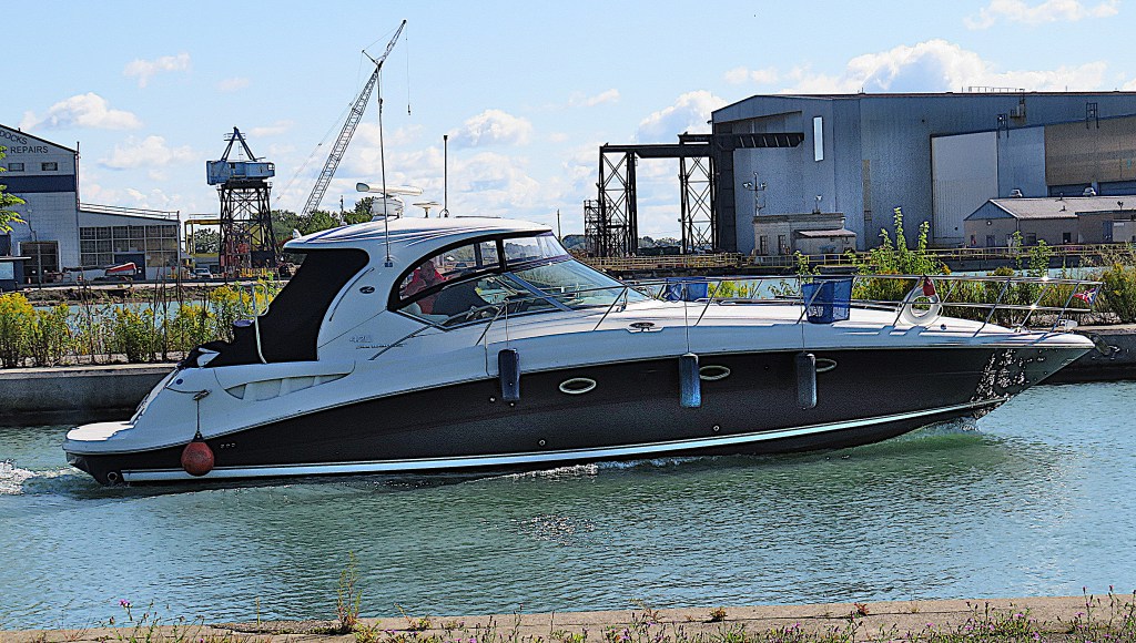 93. Pleasure boats like this may also transit the Welland Canal, though large commercial vessels are given precedence at locks. Operators must register with the Great Lakes/St. Lawrence Seaway System, book their passage online, and pay the toll in advance. The toll is a modest $30 per lock, or $240 total (plus taxes) in either Canadian or US funds for a one-way trip along the whole Canal.