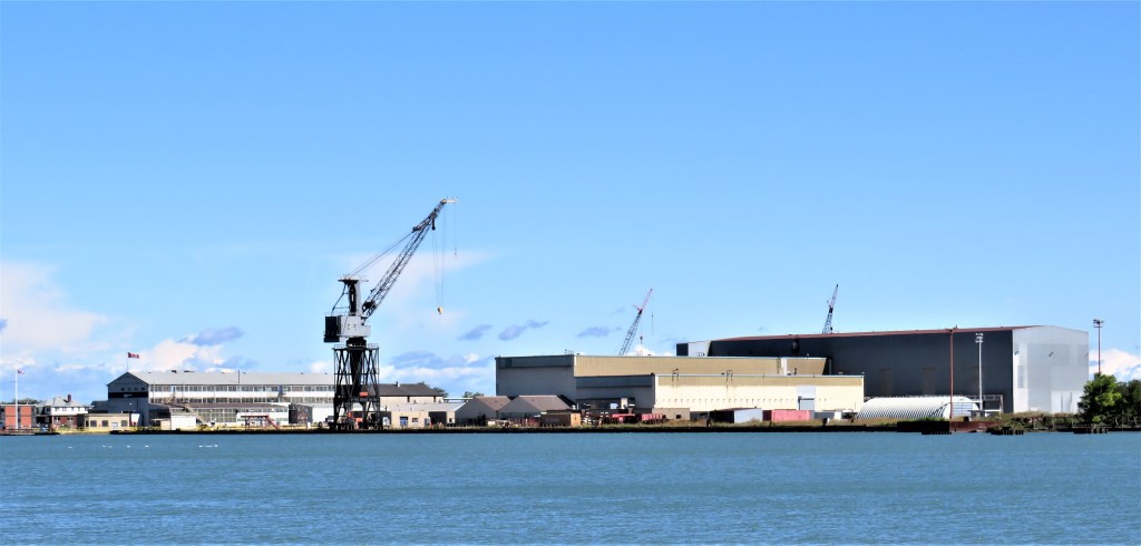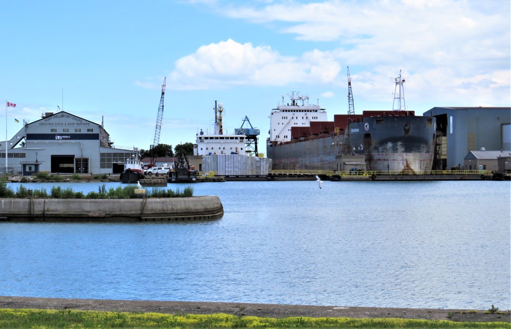 88. The Port Weller Dry Docks occupy a large area on the right bank of the Canal just south of Lakeshore Road. Their origin was a government-built facility for repairing lock gates established during the construction of the Fourth Canal. In 1946 the site was bought by Charles A. Ansell, who had worked at the Muir Brothers shipyard at Port Dalhousie (see #22 above). He founded the current dry docks, of which there are two: the “deep dock” has a depth of 7.9 metres, the same as the Canal, and is used to build or refit large ships; the “shelf,” 4.3 metres deep, is for smaller vessels. Since 1951 about 60 vessels have been built here, including bulk carriers, tankers, tugs, trawlers, barges, icebreakers, research vessels, car ferries, and self-dischargers. Since 2017, the dry docks have been leased by Heddle Marine, Canada’s largest shipyard operators, whose HQ is at Pier 14, Hamilton Harbour.