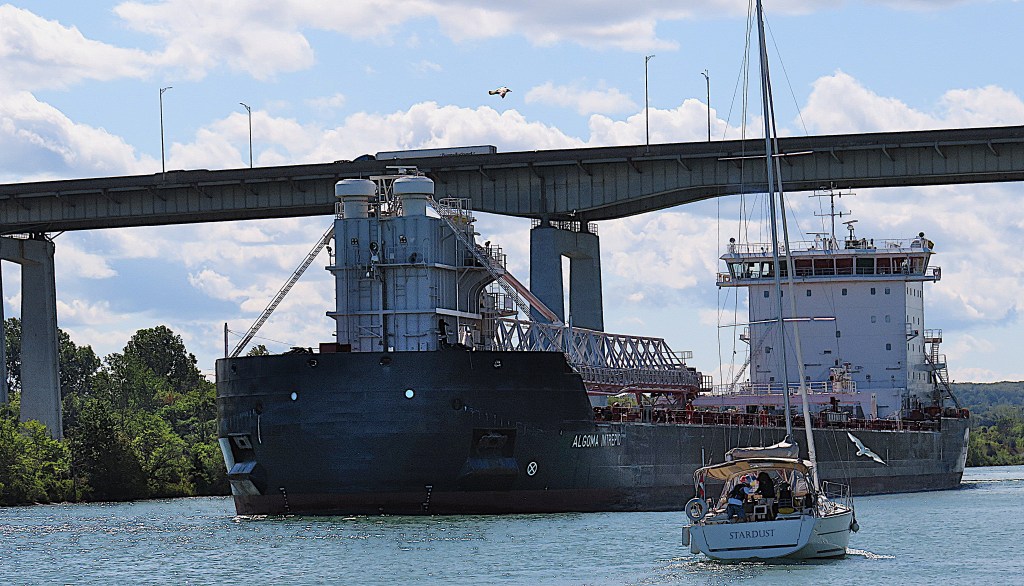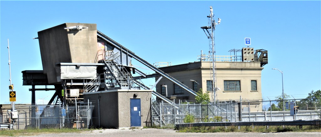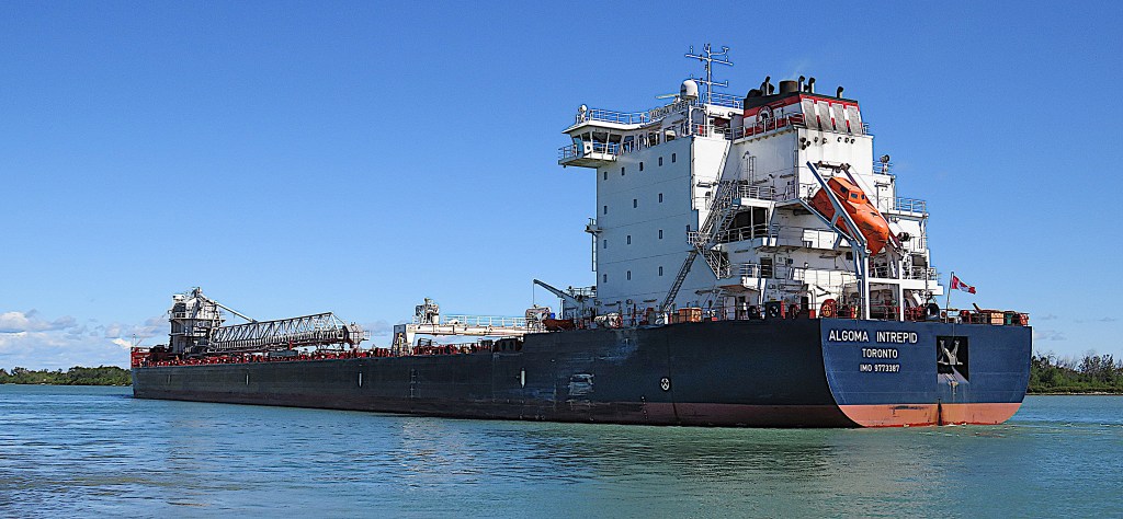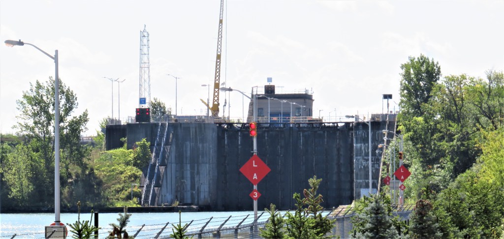 99. … and out of Lock 3 and into view sails Algoma Intrepid. She’s a spanking new self-discharging bulk carrier built in 2020, sailing under the Canadian flag with Toronto as her home port. She’s 198 metres long and 24 metres wide. Her draught – i.e., the vertical distance between waterline and keel, hence her maximum depth – is 6.9 metres, and she can carry just over 25,000 tonnes of cargo. Her forward-mounted boom allows cargo to be unloaded in narrow spaces. Her maximum unloading rate depends on what she’s carrying: 5,450 tonnes/hour for stone or 4,500 tonnes/hour for salt. As a self-discharger she is thus a half-sister to the gearless Algoma Guardian in dry dock at #91 above. Intrepid is the newest of the large fleet of cargo vessels operated by the marine subsidiary of Algoma Central Corporation of St. Catharines.