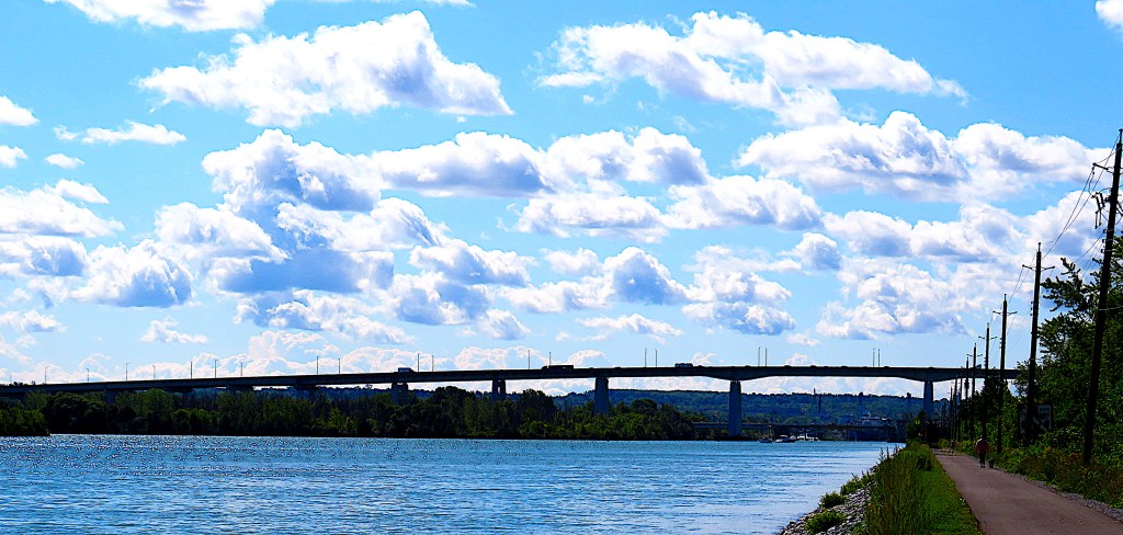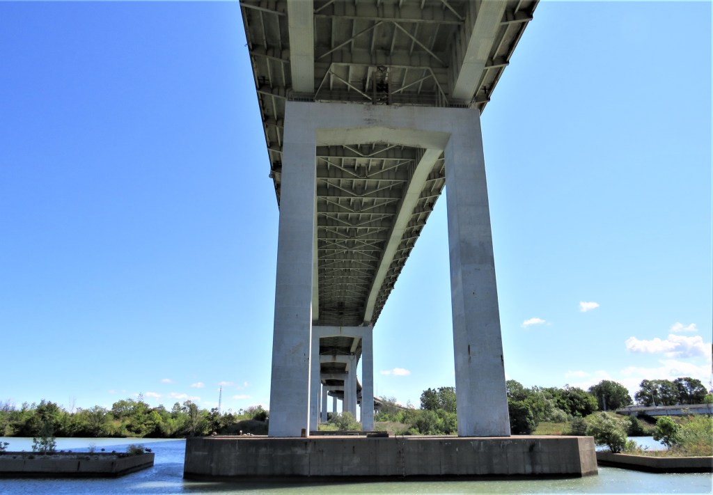 102. The Trail now passes under Bridge 4A, a.k.a. the Garden City Skyway, the fixed bridge carrying the Queen Elizabeth Way (QEW) over the Canal. The Skyway is 2.2 km long and 40 metres high at its apex, and it carries the six lanes of this major freeway between Toronto and the US border at Fort Erie/Buffalo. It was opened in 1963 (hence the “A”) and motorists were charged a toll to cross it until 1973. There are future plans to twin this bridge to allow eight lanes of traffic.