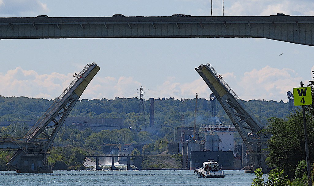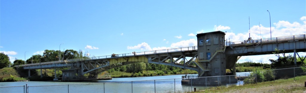 103. (Top) The leaves of Bridge 4, the only double-leaf rolling bascule bridge on the Canal, have now closed after the passage of Algoma Intrepid. This Bridge, a.k.a. the Homer Bridge after the former village of Homer that was mostly obliterated during Canal construction, carries Queenston Street over the Canal. Its counterweights are under the road surface, giving the Bridge a streamlined profile.