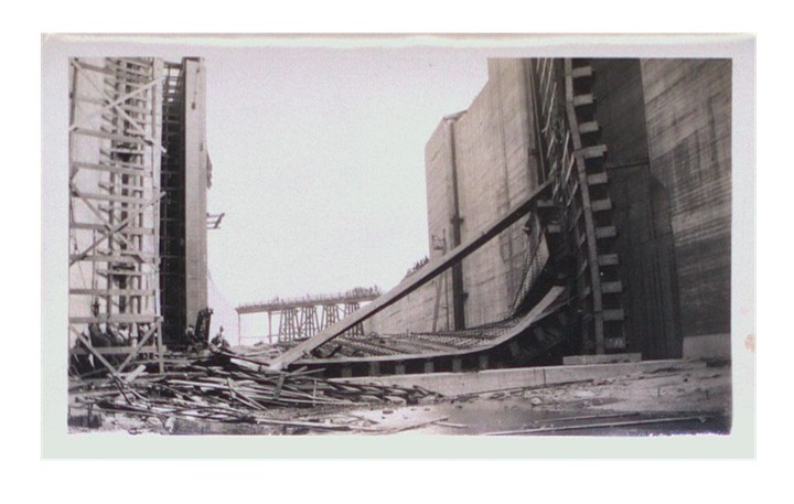 (Bottom) The collapse of a lock gate under construction at Lock 6 was the deadliest disaster to befall labourers on the Fourth Canal. On 1 August 1928, two cranes were erecting an 80 foot steel beam. The boom on one of the cranes swung out too far and the whole crane, unbalanced, fell into the lock, “tearing out the scaffolding on which the men were working and sending the gate leaf itself [weighing 500 tons] crashing down on other labourers” (R.M Styran and R.R. Taylor, This Colossal Project, p. 187). Ten men were crushed to death, eight dying on the day of the accident and two on 3 August as a result of their injuries, while 23 men were injured. The workers who lost their lives were aged between 24 and 62 and only two were Canadian born; the rest came from Ireland (3), Scotland (2), Italy, Ukraine, and Russia. The Canal’s construction was a truly cosmopolitan effort.