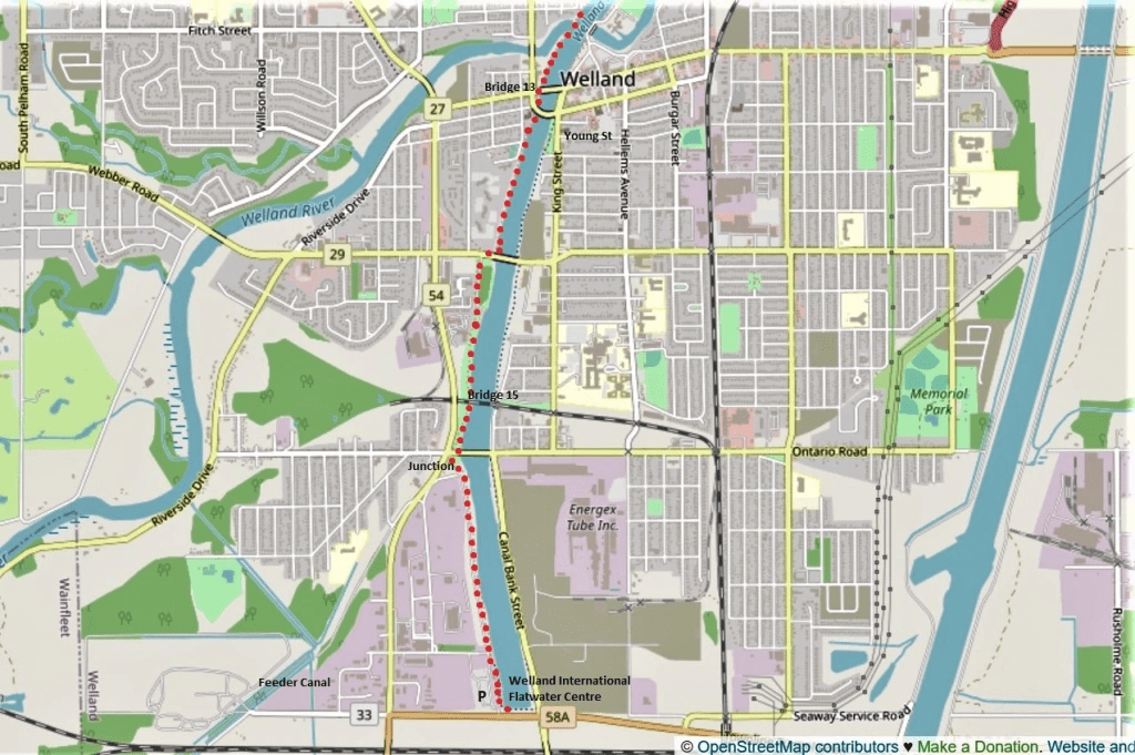 145. Today’s hike, marked with red dots on the two maps above, is 10.2 km long and will take you about 2 hours, though you may want to go a little off-piste to explore downtown Welland. You start where you finished last hike, at the free P on Bridge Street West in Port Robinson, and you finish at the large free P at the Welland International Flatwater Centre just off Townline Tunnel Road (Hwy 58A). Considering the length of this hike, you may choose to do it with a friend using two cars with one parked at each end.