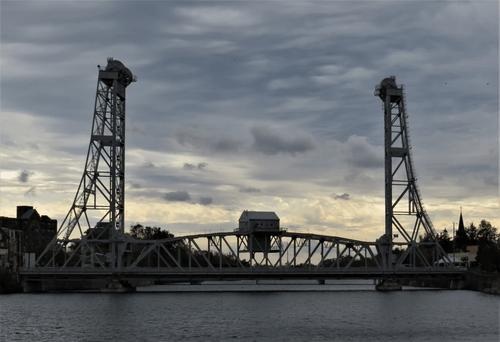 153. A moody shot of Bridge 13 in central Welland. This vertical lift bridge carries Main Street over the Recreational Waterway, and is locked permanently in the lowered position. It needn’t ever be raised because no big ships ply this Waterway any longer.