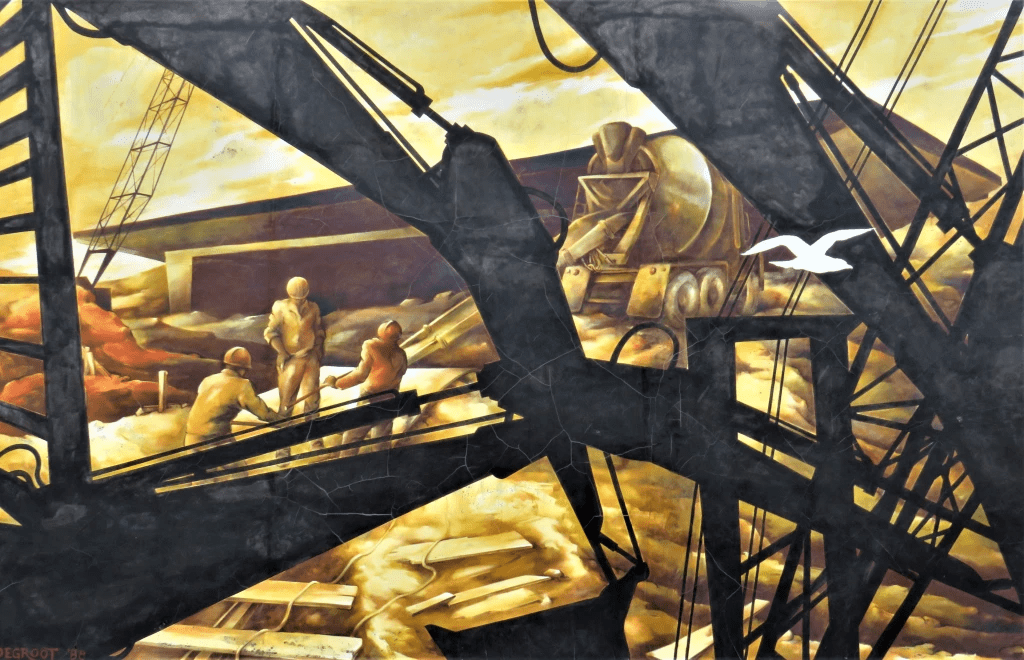 155. One of the most striking features of Welland today are its giant outdoor murals. There are at least 26 of them, most created from 1988-90. You’ll need to cross Bridge 13 to the east bank to view most of them. This one, on the front of the Welland Museum facing Young Street, is called “Canal Construction.” It depicts a scene from the building of the Welland Bypass Canal. It’s by local artist Bas Degroot (Netherlands/Canada, 1948-2001).