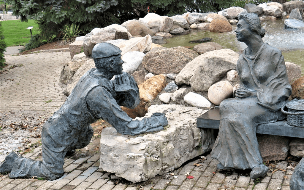 157. This is a detail of the Welland Canal Memorial Monument, unveiled in 2001 in Merritt Park. The sculpture is the work of Bas Degroot (see #155 above), who died before it was quite finished, and bronze caster William Jurgenson. It celebrates the workers who came from all over the world to build the Welland Canals.